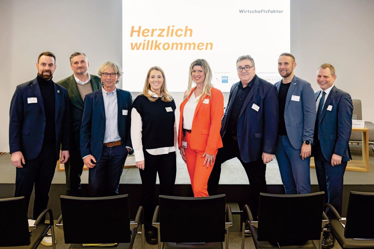 Das Foto zeigt (von links): Derek Dinger (Geschäftsführer Kassel Huskies), Dr. Arnd Klein-Zirbes (Hauptgeschäftsführer IHK Kassel-Marburg), Prof. Dr. Kuno Hottenrott, Felicitas Jordan (Leitung Marketing & digitale Entwicklung von Jordan), Natascha Gaebelein (Leitung Standortmarketing Regionalmanagement Nordhessen), Mark Weinmeister (Regierungspräsident Kassel), Kai-Georg Bachmann (Geschäftsführer Regionalmanagement Nordhessen) und Dr. Hans-Friedrich Breithaupt (Vizepräsident IHK Kassel-Marburg).Foto: Sascha Mannel
