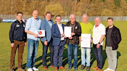 Für den SV Schweben kommt die Finanzspritze des lsb h gerade recht. Die Verantwortlichen um Christian Birkenbach, Jannik Resch, Alexander Hess und Eugen Hack haben für den Anbau eines Geräteraumes Kosten von mehr als 80.000 € eingeplant. Dafür sollen die Mittel aus dem Vereinsförderfond des lsb h komplett eingesetzt werden. In den letzten Tagen konnte das Team des Sportkreis Fulda-Hünfeld symbolisch den Förderscheck in Höhe von 8.500 € übergeben. Eugen Hack war begeistert von der Betreuung und Beratung durch lsb h und Sportkreis. Neben dem Öko-Check waren die Verantwortlichen auch zu einer Förderberatung vor Ort und standen dem SVS während des ganzen Antragsprozesses begleitend zur Seite. Dies könne man von Menschen, die sich ausschließlich im Ehrenamt engagieren, eigentlich in diesem Umfang nicht erwarten. „Es ist erstaunlich, was ihr leistet! Vielen Dank!“