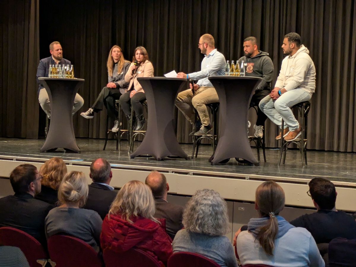 Bevor die Messe losging, wurden in einer Podiumsdiskussion die Chancen und Herausforderungen im Integrationsprozess und beim Zugang zum Arbeitsmarkt beleuchtet. Mit dabei waren drei Menschen mit Migrationshintergrund, die sich erfolgreich auf dem hiesigen Arbeitsmarkt integriert haben. Für das Handwerk waren Paulina Schmitt, Geschäftsführerin der Metzgerei Robert Müller GmbH und Co. KG und Alexander Wißler von der Ulrich GmbH dabei. Beide berichteten von den Herausforderungen der Integration, aber auch von dem außerordentlichen Gewinn für die Firmen, die diese Herausforderungen annehmen. Paulina Schmitt erläuterte den Onboarding-Prozess der Fliedener Metzgerei und zeigte auf, was man für Interessierte zu bieten hat.