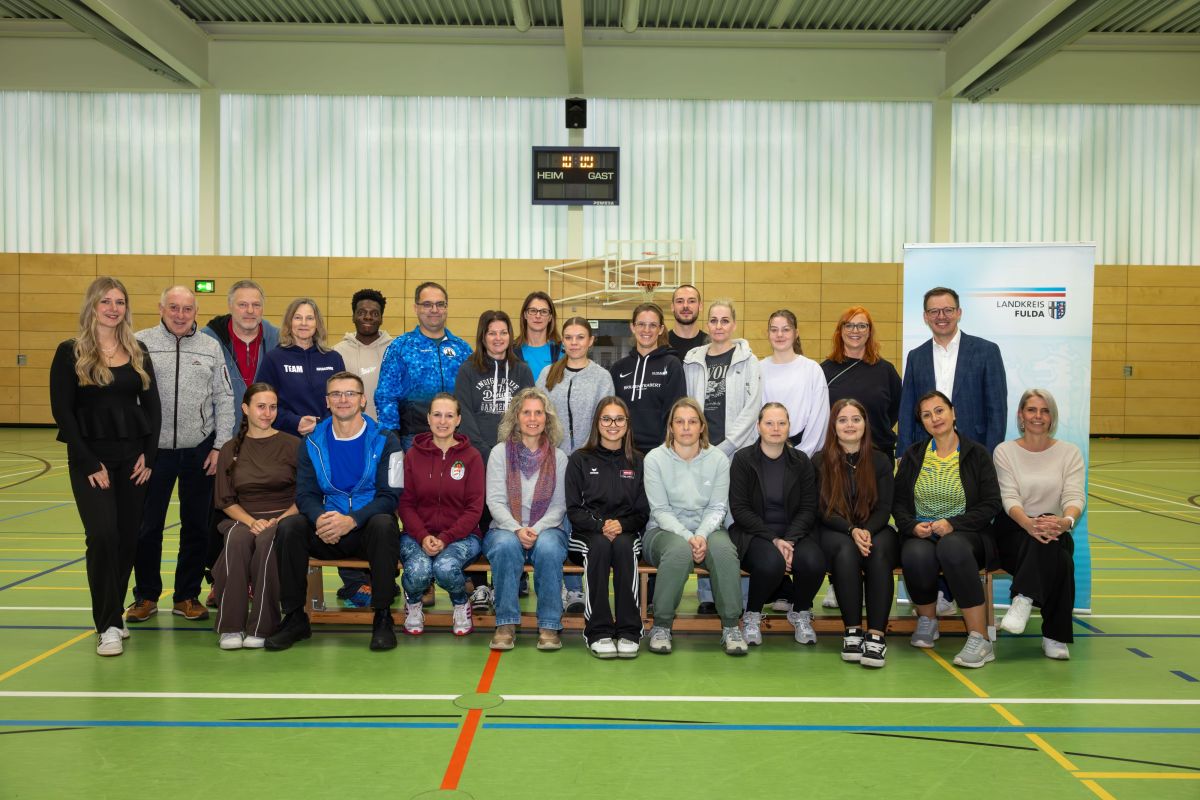Erster Kreisbeigordneter Frederik Schmitt begrüßte im Beisein des Sportkreisvorsitzenden Harald Piaskowski die Teilnehmenden und stellte fest, dass „Die Nachfrage nach Sportangeboten für Kinder und Jugendliche ist groß.Gleichzeitig fehlen den Vereinen aber ausgebildete Trainerinnen und Trainer. Mit der Kooperation und der Förderung des Lehrgangs will der Landkreis Fulda die Ausbildung neuer Übungsleiterinnen und -leiter erleichtern.“