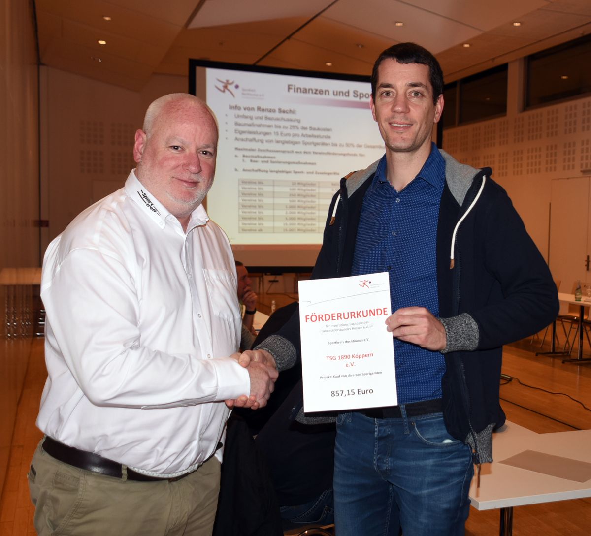 Im Rahmen dieser Veranstaltung „Sportkreis on tour“ hat Pöschl dem Vorsitzenden der TSG Köppern, David Faulstich, einen Förderbescheid über 857,15 Euro überreicht.