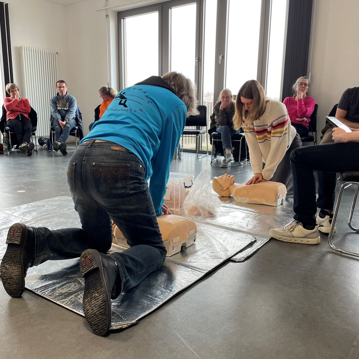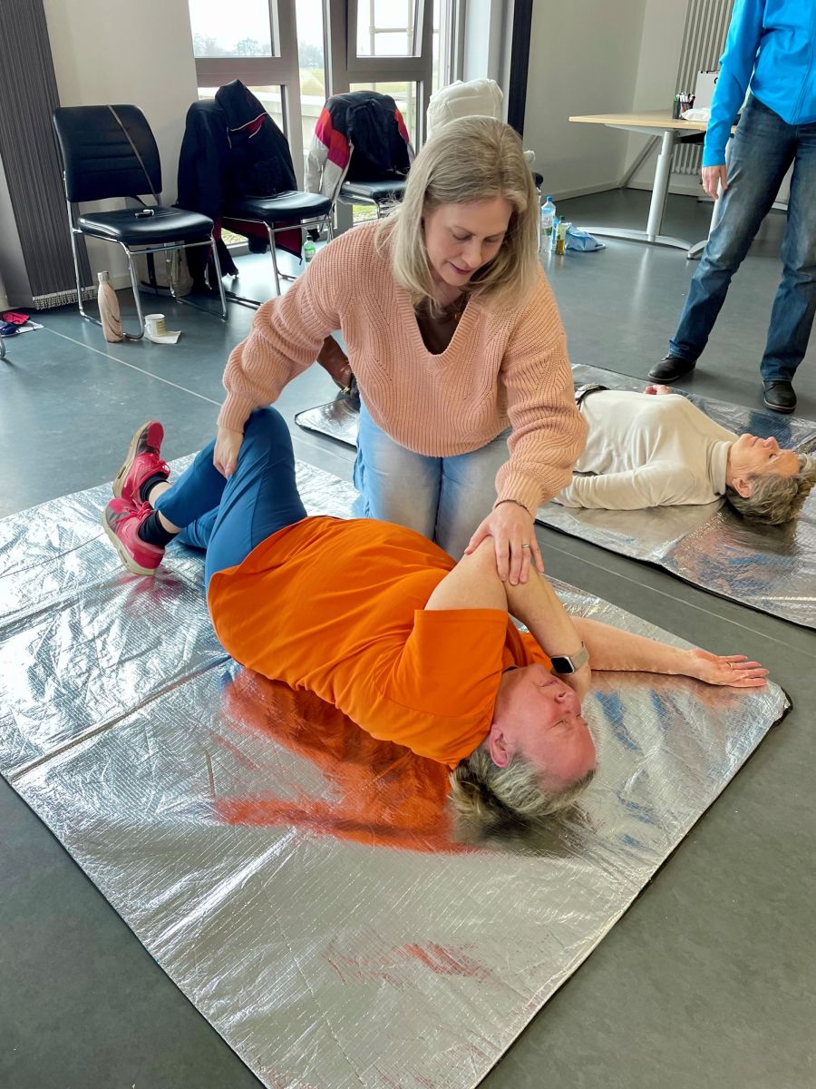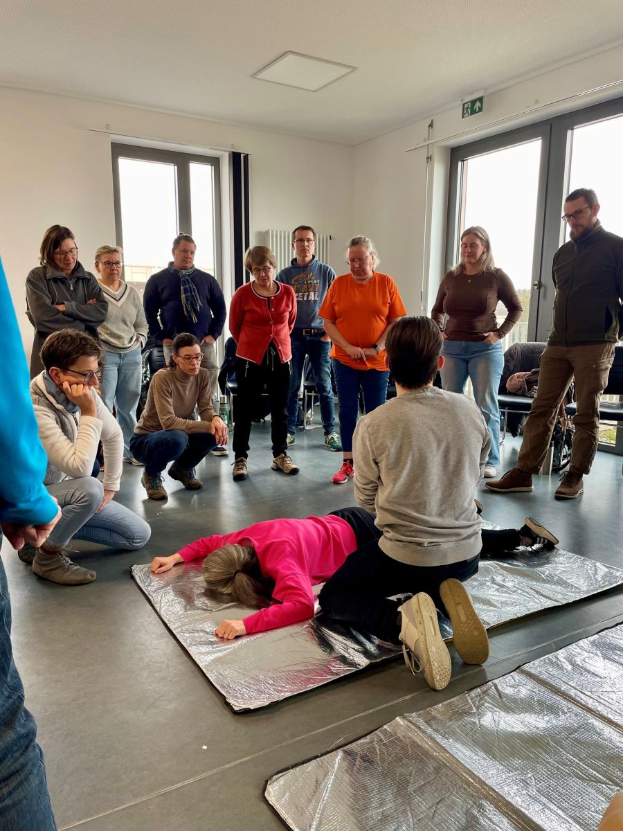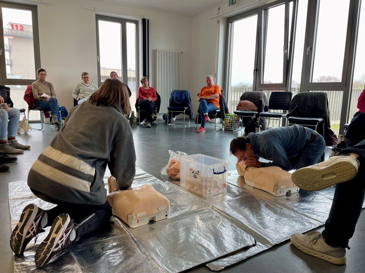 Ergänzend wurden praktische Maßnahmen wie die Umlagerung in die stabile Seitenlage, Herzdruckmassage und Beatmung, der Einsatz eines AED sowie das Anlegen eines Druckverbandes wiederholt. Dabei wurde auch besprochen, welche Lagerung in welcher Situation sinnvoll ist. Nicht immer ist die klassische Schocklage mit hochgelagerten Beinen richtig. Weitere Inhalte des Kurses waren das Erkennen von Schockzuständen, Schlaganfällen und Sepsis.