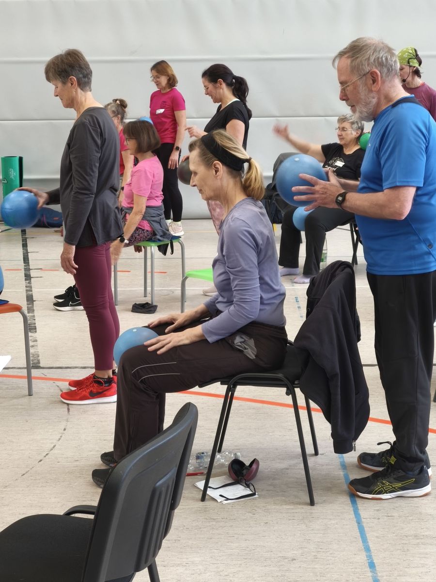 Anschließend begannen die Workshops mit den Bezeichnungen: „Stuhl und Hockergymnastik“ mit Annett Suchla van Dortmont, Referentin für u.a. Rücken, Pilates, Nordic Walking. Sie zeigte dynamische Bewegungen, verbunden mit einer Choreographie, die den Körper kräftigen und die Mobilisation stärken. Dabei kamen vielseitige Materialien zum Einsatz, wie z.B. der Redondoball.