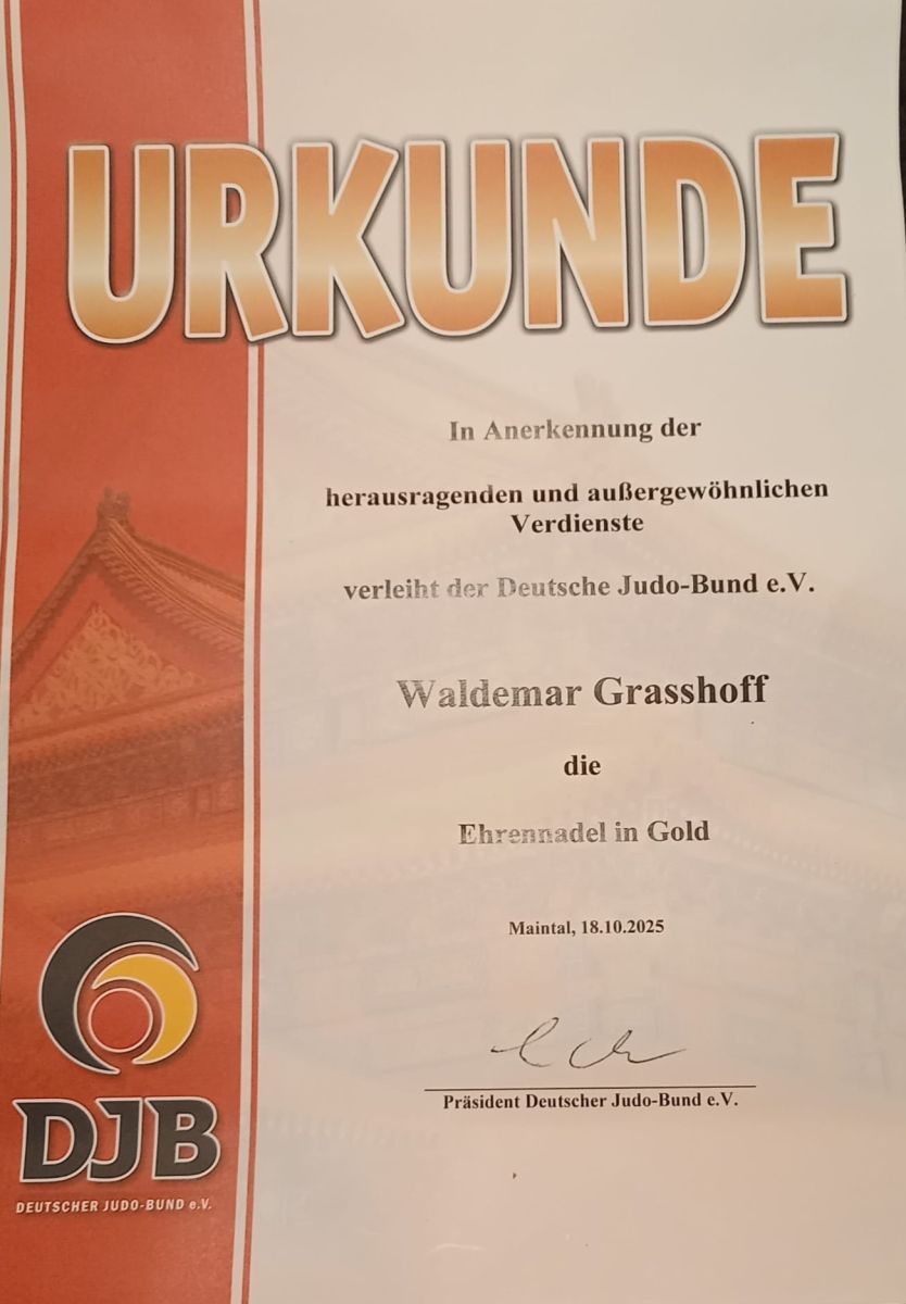 Für seine herausragenden und außergewöhnlichen Verdienste überreichte Sven Deeg, Präsident des Hessischen Judo-Verbandes, im Namen des Ehrenrates des Deutschen Judo-Bundes die Urkunde zur Verleihung der Ehrennadel in Gold, der höchsten Auszeichnung des Dachverbandes, an Waldemar Grasshoff, Nidda.