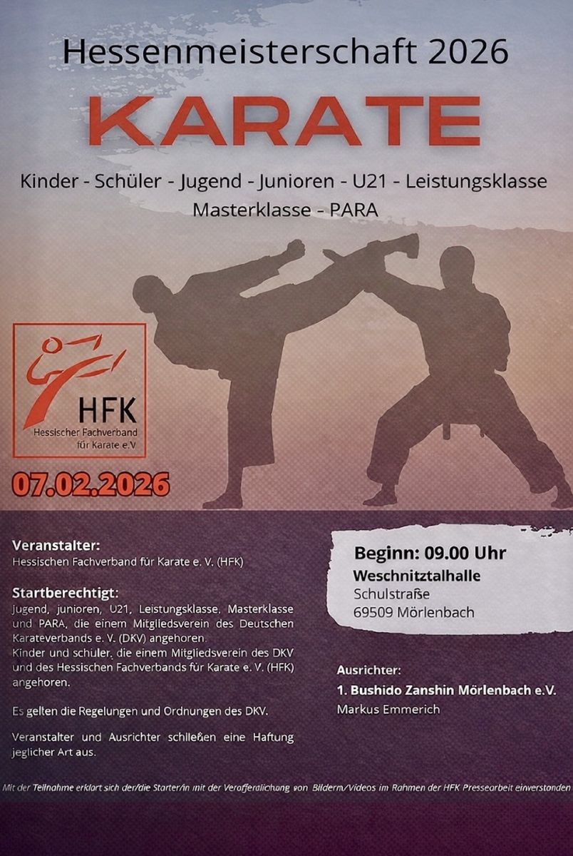Am kommenden Samstag findet die Hessische Landesmeisterschaft Karate in der Weschnitztalhalle in Mörlenbach statt. Alle Kategorien sind gelistet. Wir freuen uns auf regen Besuch und gute Stimmung von den Rängen.