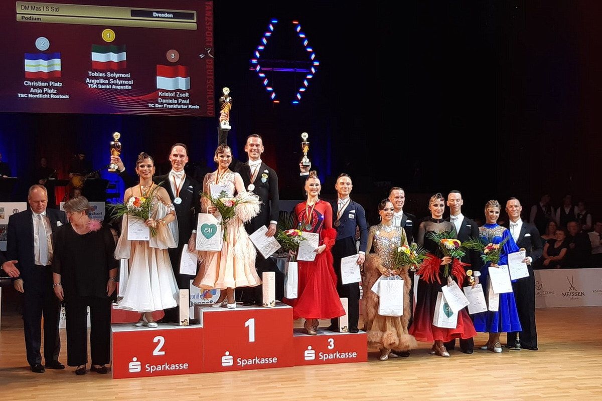 Das Feld bei der DM der Masters I S-Standard war mit 22 teilnehmenden Paaren zwar ein ganzes Stück kleiner, dafür schafften es aber zwei HTV-Vertreter ins Finale. Kristof Zsolt und Daniela Paul konnten sich mit dritten Plätzen in allen fünf Tänzen die Bronzemedaille sichern, Marc Reif und Maria Germershausen belegten - ebenfalls in allen Tänzen - den fünften Platz.